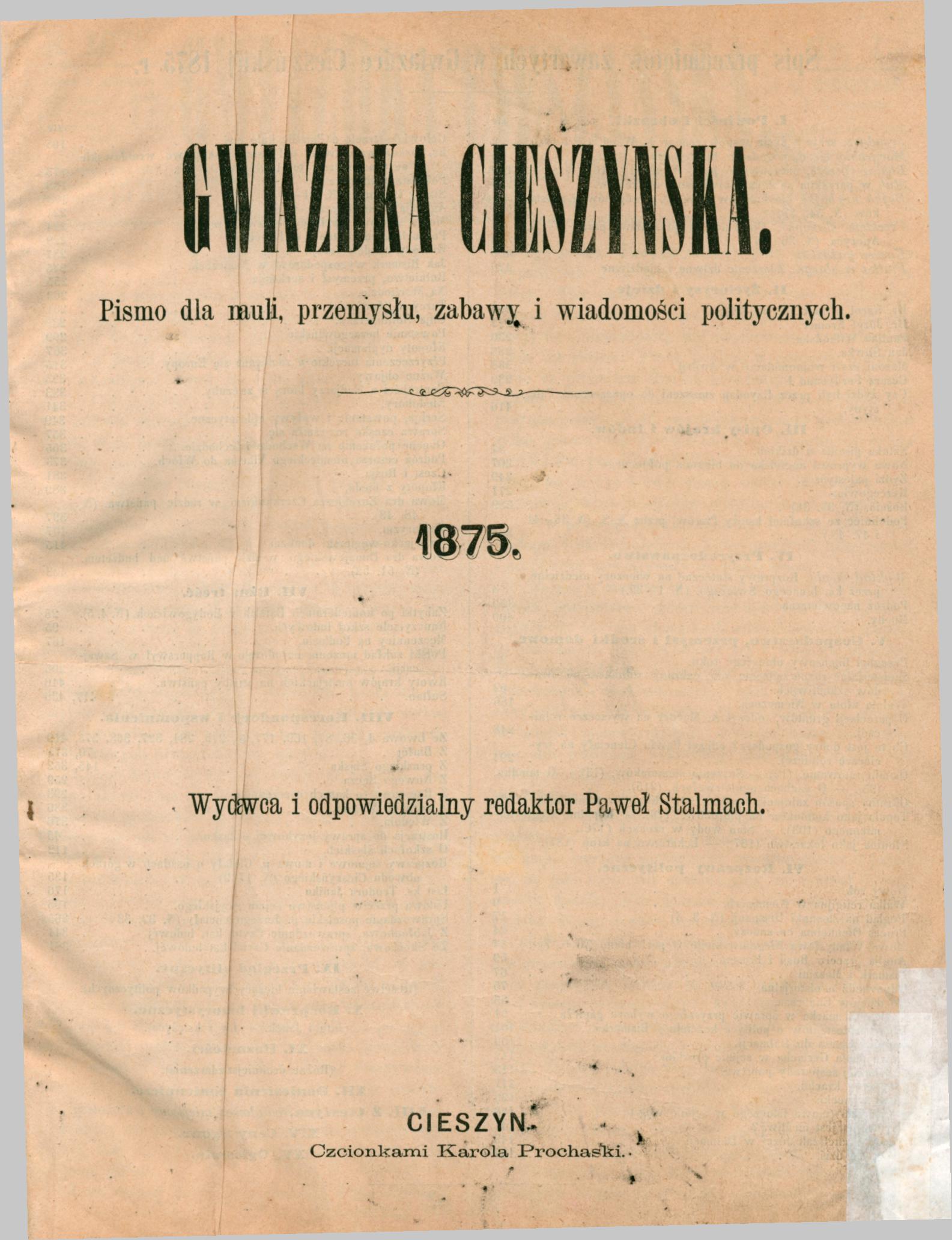 1898, nr 1-52 [br. nr 23]. Rocznik 1898 zmikrofilmowany z 1861, sygn.: Gwiazdka Cieszyńska MF 1861, nr. inw. 3762