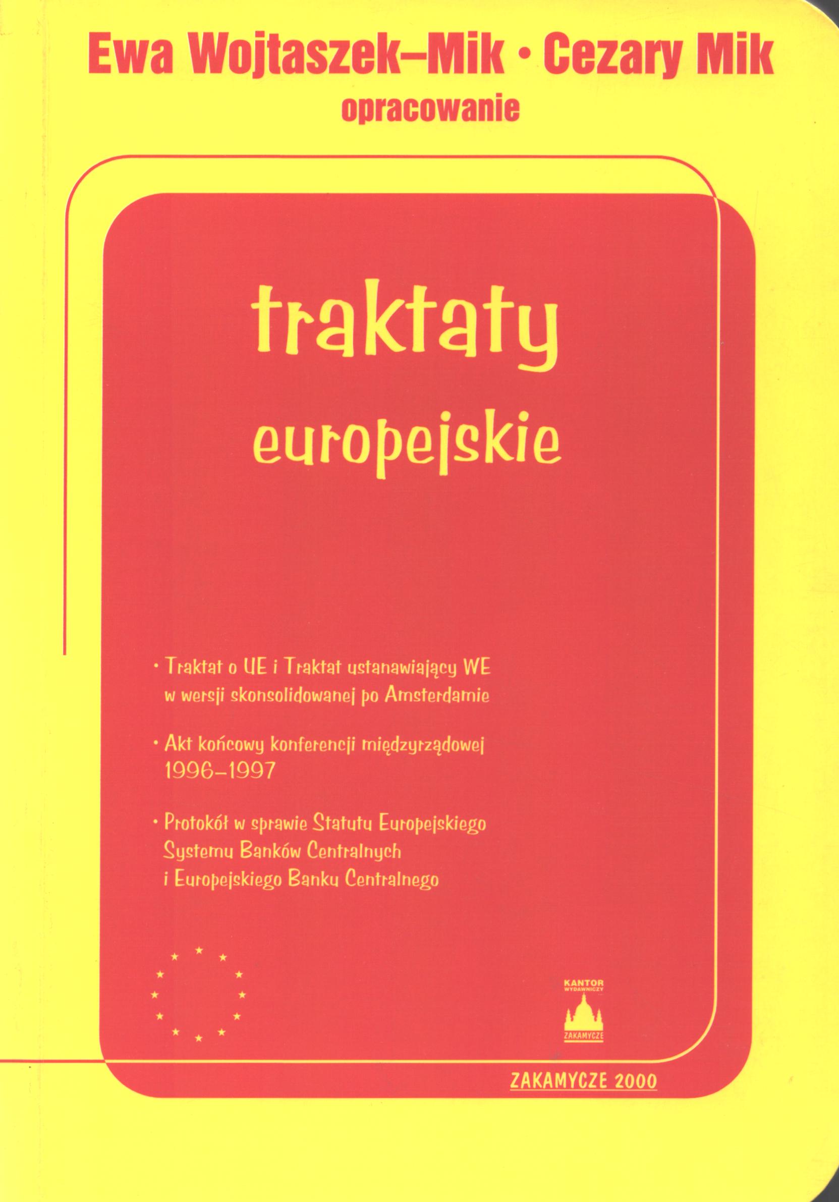 Na okł. podtyt.: Traktat o UE i Traktat ustanawiajacy WE w wersji skonsolidowanej po Amsterdamie, Akt końcowy konferencji międzyrządowej 1996-1997, Protokół w sprawie Statutu Europejskiego, Systemu Banków Centralnych i Europejskiego Banku Centralnego.