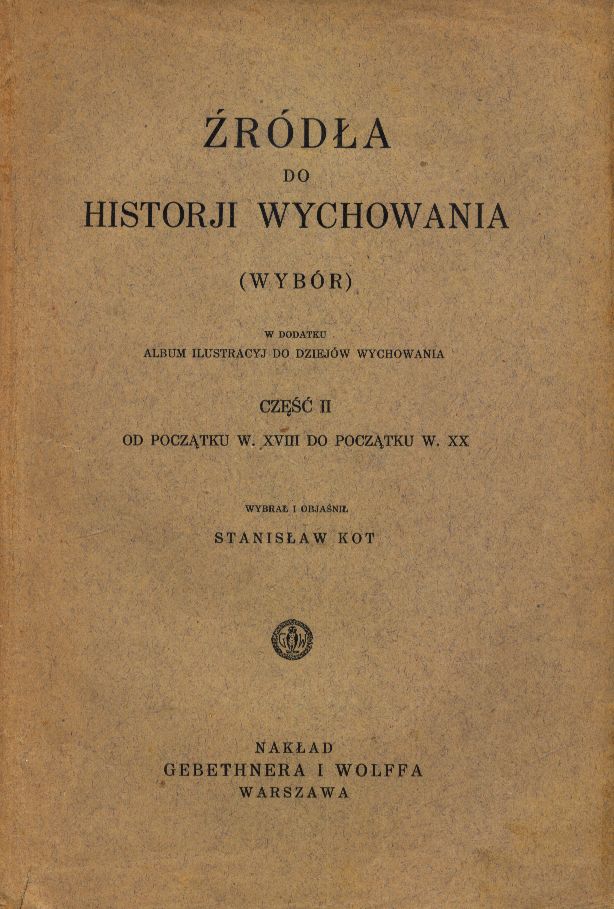 Źródła do historji wychowania : (wybór). Cz. 2, Od początku w. XVIII do poczatku w. XX / wybrał i objaśnił Stanisław Kot. - Warszawa : Gebethner i Wolff, 1930 (Kraków : W. L. Anczyc i Spółka). - VIII, 423 strony ; 24 cm + Dodatek: Album ilustracyj do dziejów wychowania : [48] stron : ilustracje. .