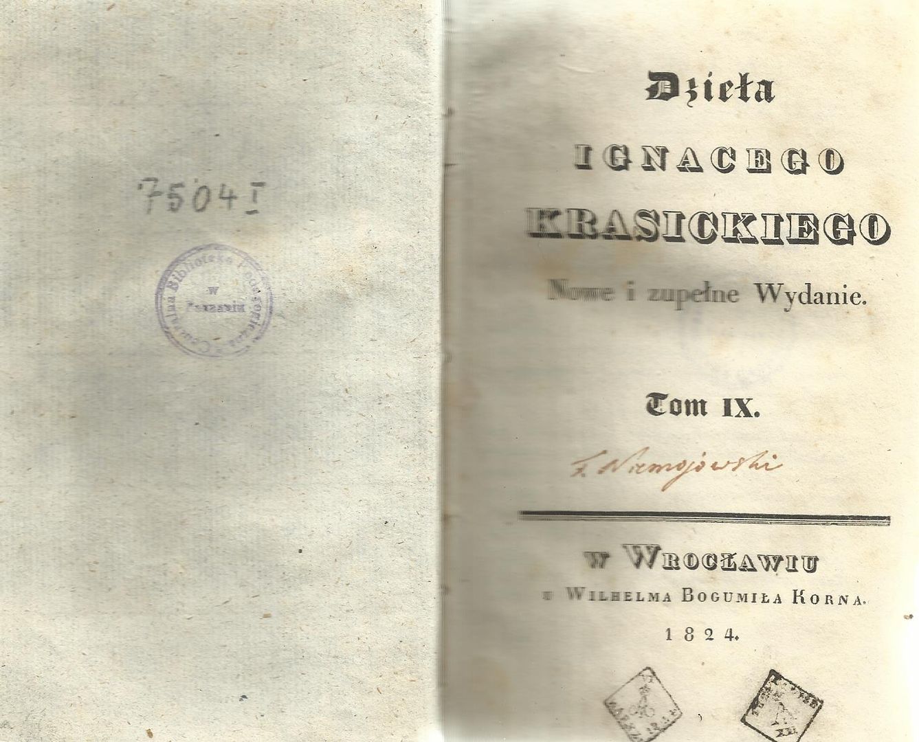 Dzieła Ignacego Krasickiego. T. 9. - Nowe i zupełne wyd. - Wrocław : W. B. Korn, 1824. - 444 s. ; 16 cm.