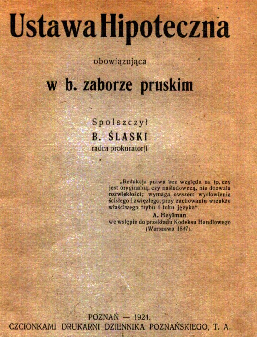 Ustawa hipoteczna obowiązująca w b. zaborze pruskim / spolszczył B. Ślaski. - Poznań : [s.n.], 1924 (Poznań : czcionkami drukarni Dziennika Poznańskiego). - 22 s. ; 19 cm.