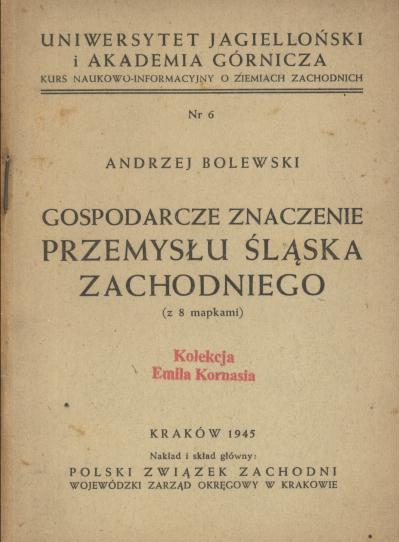 Gospodarcze znaczenie przemysłu Śląska Zachodniego / Anrzej Bolewski. - Kraków : nakład Polski Związek Zachodni, 1945 (Kraków : Drukarnia Narodowa). - 48 s. : mapy ; 15 cm.