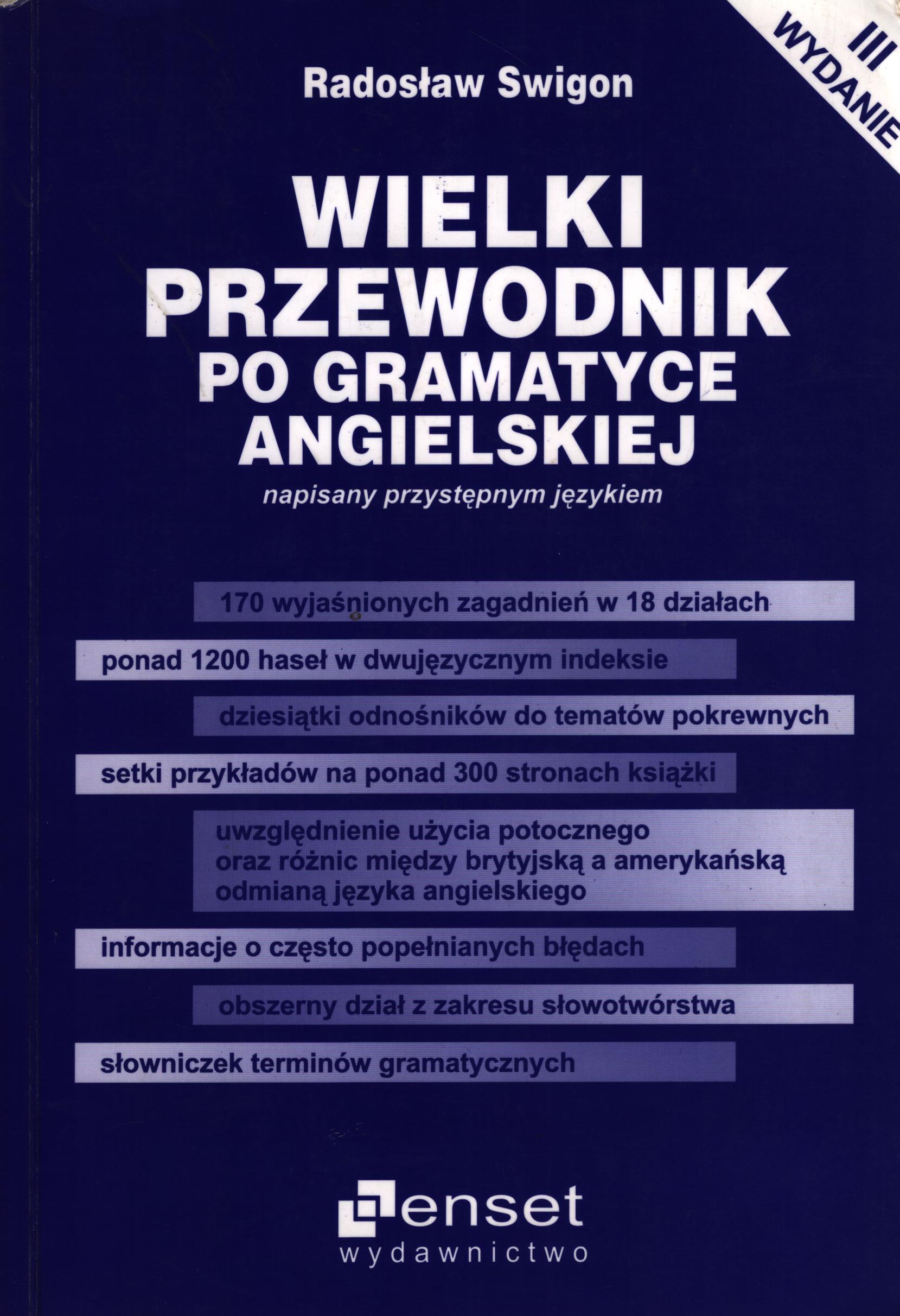 Wielki przewodnik po gramatyce angielskiej / Radosław Swigon. - Wydanie trzecie. - Bydgoszcz : Wydawnictwo Enset, 2006. - 336 stron ; 21 cm.