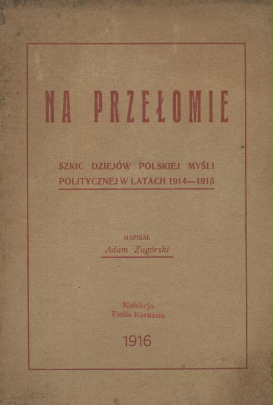 Na przełomie : szkic dziejów polskiej myśli politycznej w latach 1914-1915 / Ad. Z. - Piotrków : [s.n.], 1916 (Piotrków : Drukarnia Państwowa pod zarządem Departamentu Wojskowego N. K. N.). - 84, [3] s. ; 23 cm.