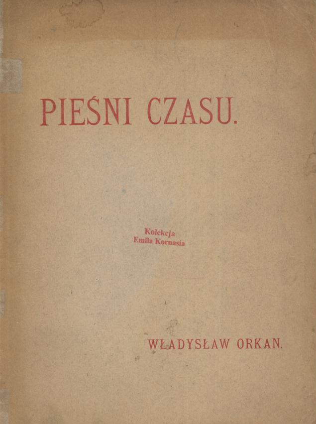 Pieśni czasu / Władysław Orkan. - Piotrków : [s.n.], 1915 (Piotrków : Drukarnia Państwowa pod zarządem Departamentu Wojskowego Naczelnego Komitetu Narodowego). - 44, [3] s. ; 22 cm.