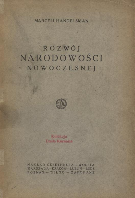 Rozwój narodowości nowoczesnej. [T. 1] / Marceli Handelsman. - Warszawa : Gebethner i Wolff, [1924] (Warszawa : L. Bogusławski). - VIII, 267, [1] s. ; 25 cm.