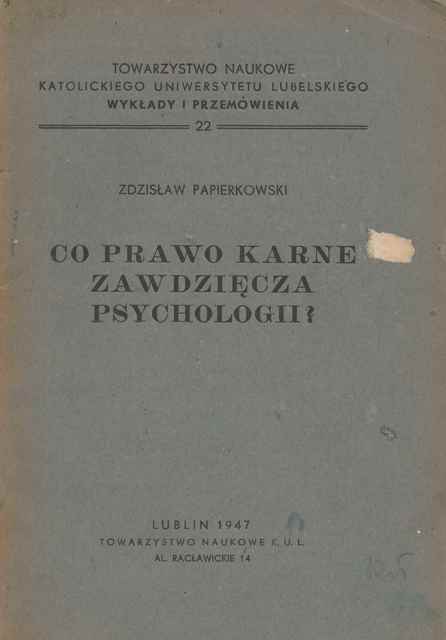 Co prawo karne zawdzięcza psychologii? / Zdzisław Papierkowski. - Lublin : Towarzystwo Naukowe KUKL, 1947 (Lublin : Pierwsza Drukarnia Państwowa). - 28 s. ; 22 cm.
