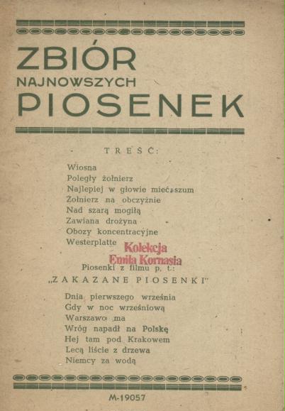 Zawiera m.in.: Wiosna ; Poległy żołnierz ; Najlepiej w głowie mieć szum ; Dnia pierwszego września ; Gdy w noc wrześniową ; Warszawo ma.