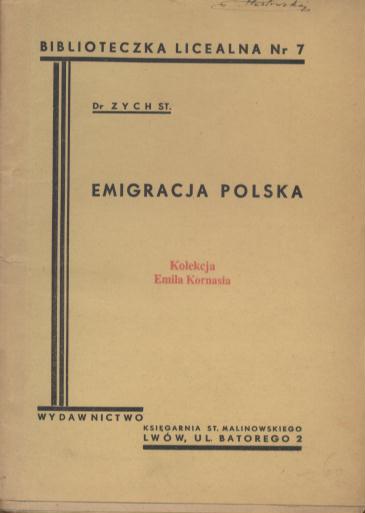 Emigracja polska / dr. St. Zych. - Lwów : Wydawnictwo Księgarnia St. Malinowskiego, [1938] (Lwów : Nowa Drukarnia Lwowska). - 33, [1] s., [1] k. tabl. złoż. ; 18 cm.
