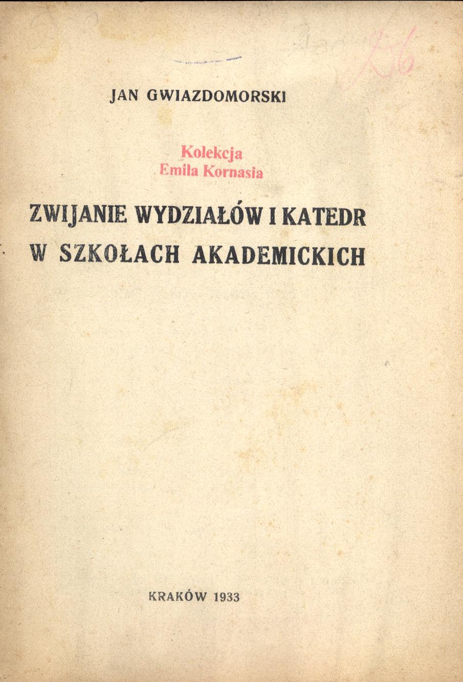 Zwijanie wydziałów i katedr w szkołach akademickich / Jan Gwiazdomorski. - Kraków : [s.n.], 1933 (Kraków : Druk. "Czasu" pod zarz. L. Wójcika). - 19 s. ; 18 cm.