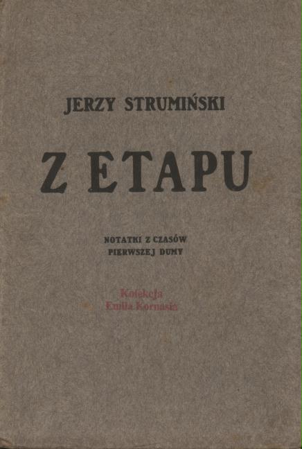 Z etapu : notatki z czasów pierwszej Dumy / Jerzy Strumiński. - Kraków : skł. gł. Gebethner i Ska, 1907 (Kraków : Drukarnia Narodowa). - 65 s. ; 17 cm.