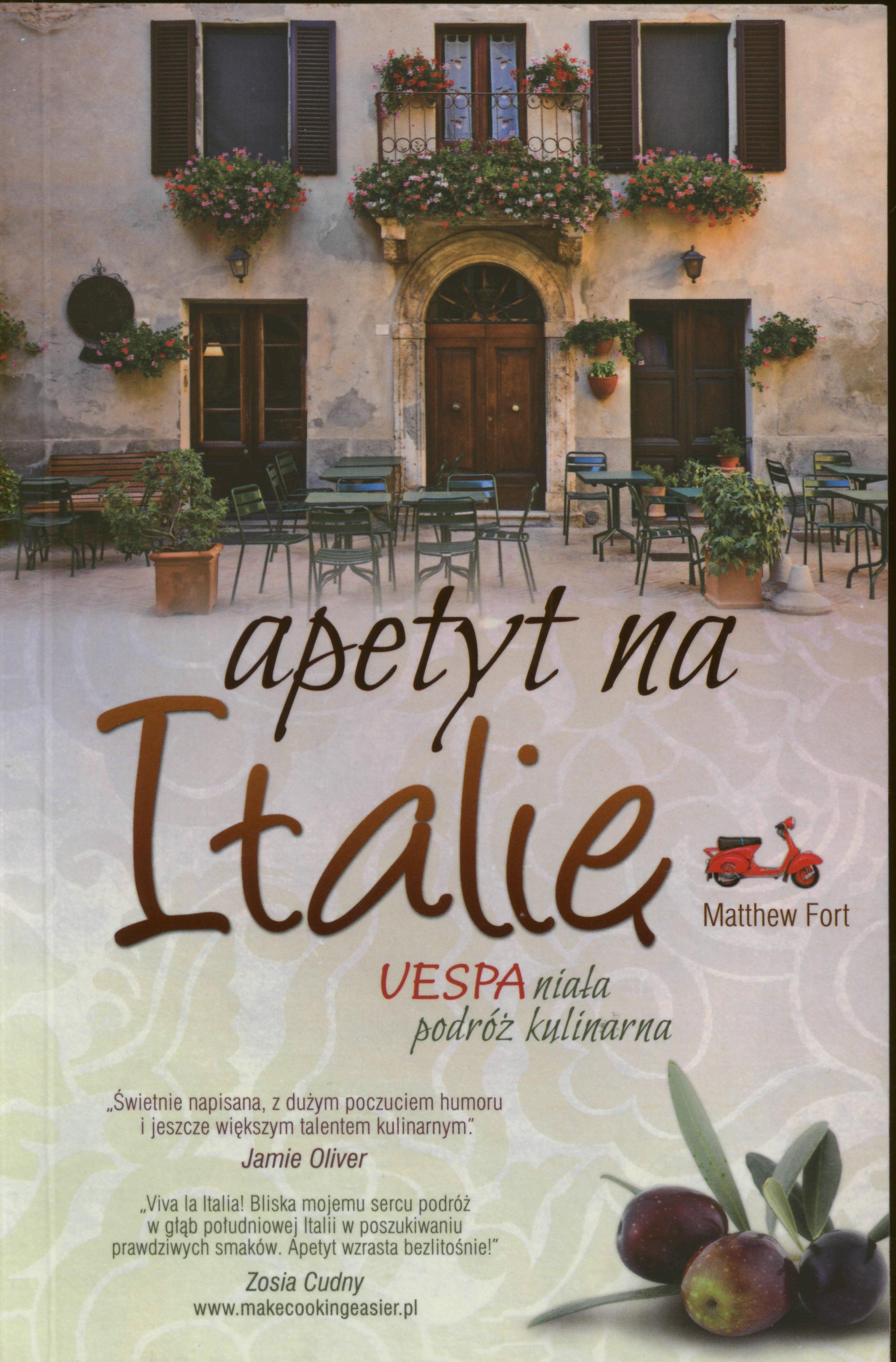 Matthew Fort, brytyjski pisarz i krytyk kulinarny, rusza VESPĄ śladem włoskich rarytasów. Podróż zaczyna w słonecznej Kalabrii, a kończy w Turynie. Pomysł podróży skuterem przez skąpany w słońcu krajobraz był naprawdę romantyczny. Wiązał się z poczuciem wolności, przygody, potencjalnych odkryć i seksualnych możliwości. Wiatr we włosach, słońce w plecy, droga wijąca się ku morzu, nieznane cuda za każdym rogiem. Południe zwiedza z czarującą Silvią, która wprowadza go w tajniki rodzimej kuchni. Neapol wita go tłumem turystów i zapachem prawdziwej pizzy. Po drodze poznaje ludzi, którzy o włoskiej kuchni wiedzą wszystko. Wybierz się w podróż marzeń! Poznaj smak aromatycznego prosciutto, odwiedź najstarsze włoskie manufaktury, dowiedz się, skąd pochodzi confetti i dlaczego likier Meletti jest tak pyszny? Specjalnie dla Ciebie Matthew Fort zdradza prawie 60 pilnie strzeżonych przepisów, których nie znajdziesz nigdzie indziej.