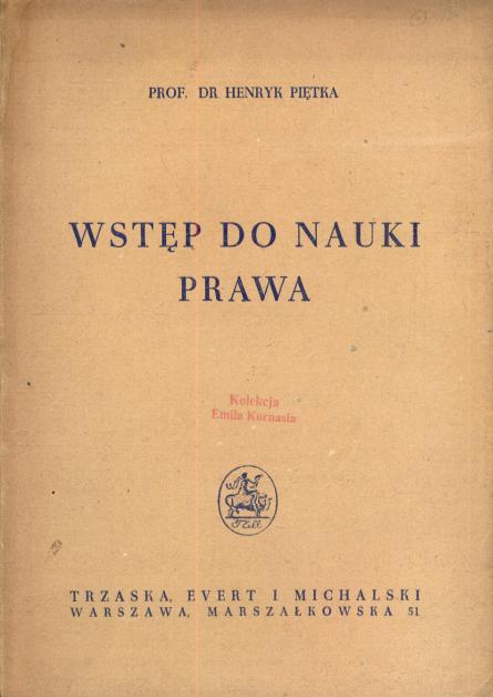 Wstęp do nauki prawa / Henryk Piętka. - Wyd. 2 rozszerz. i uzup. - Warszawa : Trzaska, Evert i Michalski, [1947] (Warszawa : Drukarnia Krakowska W. Grzelak i Sp.). - 259, [1] s. ; 22 cm.