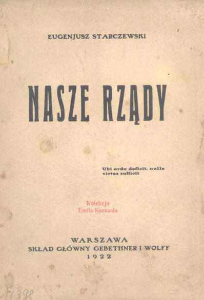 Nasze rządy / Eugeniusz Starczewski. - Warszawa : Gebethner i Wolff, 1922 (Warszawa : J. Burian). - 169, [2] s. ; 23 cm.