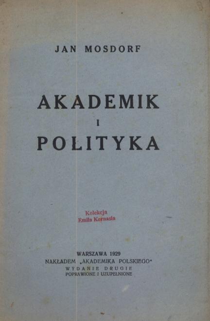Akademik i polityka / Jan Mosdorf. - Wyd. 2 popr. i uzup. - Warszawa : "Akademik Polski", 1929 (Warszawa : "A. Michalski"). - 20 s. ; 24 cm.