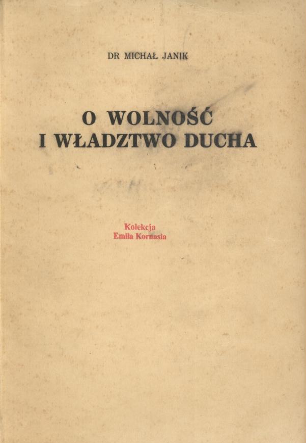 O wolność i władztwo ducha : spowiedź niepodległościowca / Michał Janik. - Kraków : [s.n.], 1939 (Kraków : Druk W. L. Anczyca i Spółki). - 325, [2] s., [6] k. tabl. : il., portr. ; 24 cm.