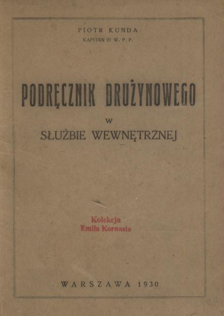 Podręcznik drużynowego w służbie wewnętrznej / Piotr Kunda. - Warszawa : [s.n.], 1930 (Warszawa : Druk Leona Wolnickiego). - 119, [1] s. ; 23 cm.