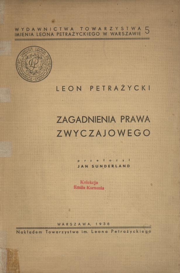Zagadnienia prawa zwyczajowego / Leon Petrażycki ; przełożył Jan Sunderland. - Warszawa : nakładem Towarzystwa im. Leona Petrażyckiego, 1938 (Warszawa : Drukarnia Piotr Pyz i S-ka). - 84, [1] s., 1 k. tabl. ; 24 cm.