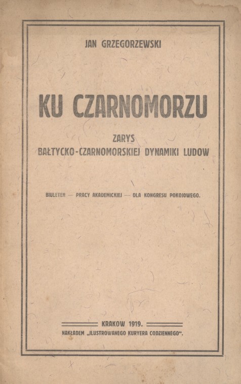 Ku Czarnomorzu : zarys bałtycko-czarnomorskiej dynamiki ludów : biuletyn pracy akademickiej dla Kongresu Pokojowego / Jan Grzegorzewski. - Kraków : nakładem "Ilustrowanego Kuryera Codziennego", 1919 (Kraków : Drukarnia "Ilustrowanego Kuryera Codziennego" pod zarządem Leonarda Zabłockiego). - 20 s., [1] tabl. : mapa ; 21 cm.