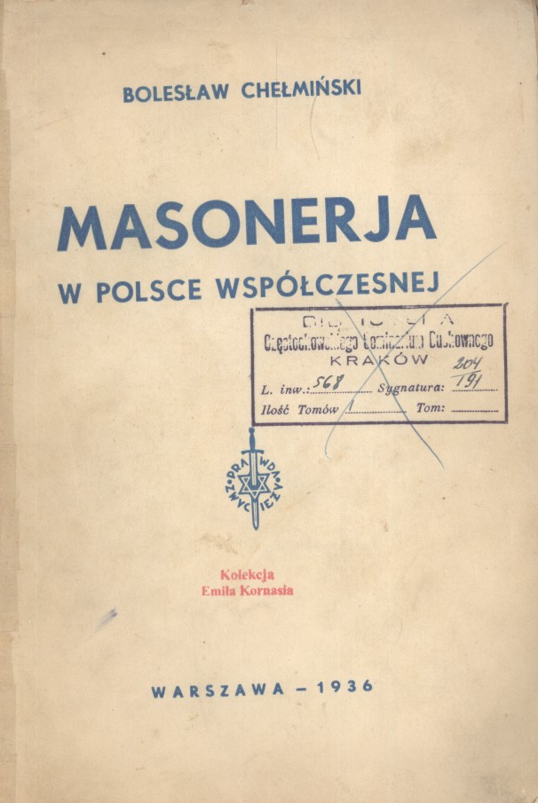 Masonerja w Polsce współczesnej / Bolesław Chełmiński. - Warszawa : [s.n.], 1936 (Warszawa : Druk. "Wzór"). - 221, [2] s., [1] k. tabl. : il. ; 24 cm.