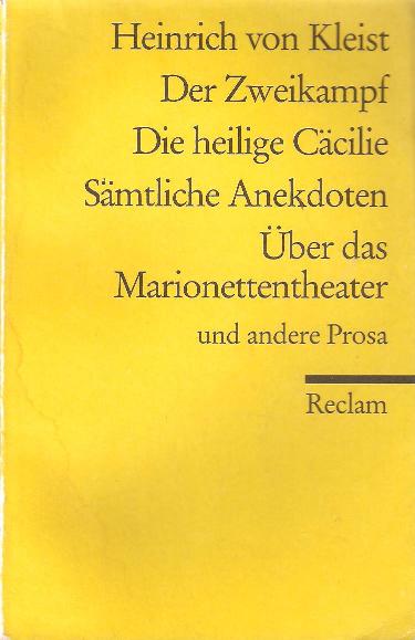 Diese Reclam Ausgabe vereint 2 Erzählungen Kleists mit den Anekdoten, die er für seine eigene Zeitung, die Berliner Tageblätter, verfasste. Des Weiteren sind noch die einzigen zwei Fabeln, die Kleist je geschrieben hat und zwei Essays enthalten, "Über das Marionettentheater" und die kurze, aber bis heute unerhört kluge und treffliche philosophische Betrachtung mit dem Namen "Über die allmähliche Verfertigung der Gedanken beim Reden." Die Geschichte "Der Zweikampf" ist, wie viele von Kleists Texten und Dramen, um Irrungen, Intrigen und eine Liebesgeschichte gesponnen. Bemerkenswert ist weniger die Darstellung einer simplen Rätselgeschichte, als das brillant als Metapher verwendete Symbol des Zweikampfs, der ja, so glaubten die Zeitgenossen Kleists, ein göttliches Urteil war; dergestalt, dass der, der gewann, auch im Recht war und der andere ward ein Lügner und gehörte zum Tode verurteilt. Es ist eine spannende und doch sehr dialektische Erzählung. Die heilige Cäcilie ist weniger eine Geschichte als lang gezogene Anekdote. Es geht um die Kraft der Musik, in Verbindung mit dem religiösen Glauben. Sie ist nicht fesselnd und auch nicht spannend zu lesen und ich halte sie sogar für etwas misslungen, jedoch könnte sie bei Liebhabern gut erzählter Wundergeschichten vielleicht Leser finden. Die Anekdoten sind kleine, 1-2seitige Texte. Viele haben ihren eigentlichen Glanz mit der Zeit ein wenig verloren, doch waren sie (für mich) sehr interessant als zeithistorische Dokumente. Es geht darin um Phänomene, dann sind da Geschichten aus den Kriegen des 18. Jahrhunderts, einfacher Schabernack, kleine Gesellschaftstechtelmechtel und wie witzigen Aussprüche von einem, der einen andern zum Richtplatz führt. Unterhaltsam sind die kleinen Schriften allemal.