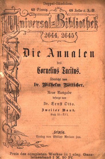 Die Annalen des Cornelius Tacitus. Bd. 2, Buch XI-XVI / übersetzt von Wilhelm Bötticher. - Neue Ausgabe / besorgt von Ernst Otto. - Leipzig : Phillip Reclam Junior, [1890]. - 224 strony, [1] karta tablic złożona ; 15 cm.
