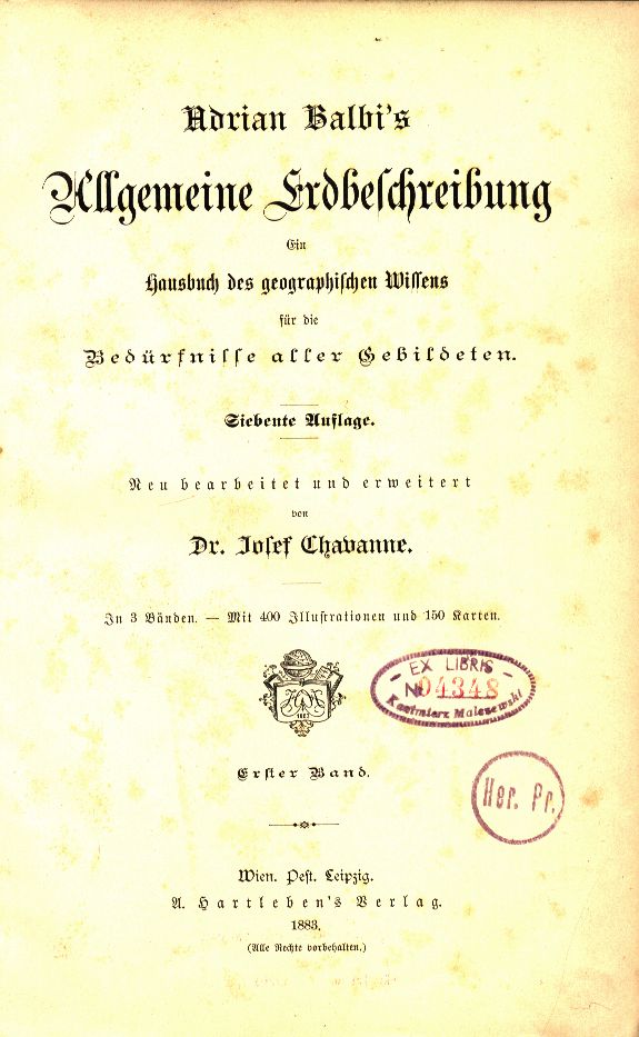 Allgemeine Erdbeschreibung : ein Hausbuch des geographischen Wissens für die Bedürfnisse aller Gebildeten. Band. 1 / Adriano Balbi. - 7. Auflage / neu bearbeitet und erweitert von Josef Chavanne. - Wien ; Pest ; Leipzig : A. Hartleben's Verlag, 1883. - VIII, 984 strony : ilustracje ; 25 cm.