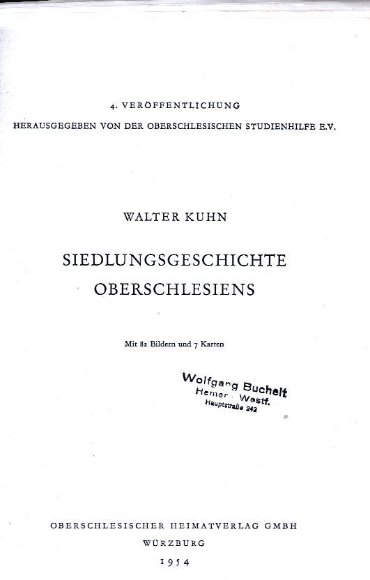 Siedlungsgeschichte Oberschlesiens / Walter Kuhn. - Würzburg : Oberschlesischer Heimatverlag GmbH, 1954. - 395 stron, [4] kart : ilustracje, mapy ; 21x30 cm.