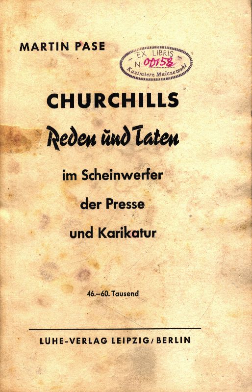 Churchills Reden und Taten im Scheinwerfer der Presse und Karikatur / Martin Pase. - 46.-60. Tausend. - Leipzig ; Berlin : Lühe-Verlag, [po 1941]. - 104, [1] strona : ilustracje ; 20 cm.
