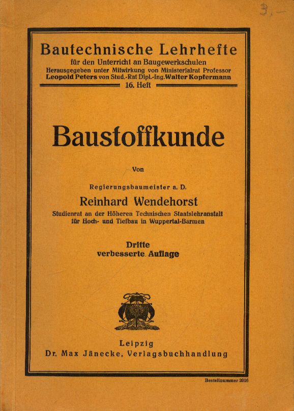 Baustoffkunde / von Reinhard Wendehorst. - Dritte verbesserte Auflage. - Leipzig : Max Jänecke Verlagsbuchhandlung, 1932. - 127 stron ; 20 cm.