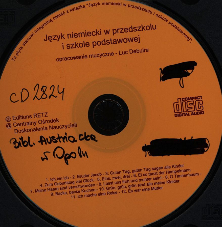 Język niemiecki w przedszkolu i szkole podstawowej / opracowanie muzyczne Luc Debuire. - Berlin : Editions RETZ, Centralny Ośrodekm Doskonalenia Nauczycieli, 2004. - 1 audio CD ; 12 cm.
