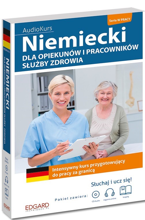 Intensywny kurs do nauki języka niemieckiego skierowany jest do opiekunów osób starszych, rehabilitantów, pielęgniarek, pielęgniarzy, lekarzy i innych pracowników służby zdrowia. Powstał z myślą o osobach, które poznały podstawy języka niemieckiego i chcą w krótkim czasie opanować niezbędne słownictwo związane z pracą w zawodzie. Zawiera zwroty i wyrażenia, które będą pomocne w codziennych sytuacjach, a także specjalistyczne słownictwo przydatne w kontakcie z innymi pracownikami opieki medycznej. Kurs kształci praktyczne umiejętności z zakresu komunikacji zawodowej. Każdy rozdział składa się z czterech części: dialogów, słownictwa, ćwiczeń i nauki wymowy. Tematy lekcji zostały dobrane tak, aby umożliwić uczącemu się zapoznanie się ze zwrotami najbardziej przydatnymi podczas codziennej pracy. 14 rozdziałów tematycznych dotyczy takich zagadnień jak: rozmowa o pracę, wdrożenie w obowiązki na danym stanowisku, komunikacja z osobami starszymi i chorymi, udzielanie pierwszej pomocy, informacje dotyczące systemu opieki zdrowotnej w Niemczech. W podręczniku znajdują się praktyczne wskazówki, jak poprawnie wymawiać wyrazy i zdania w języku niemieckim. Książkę uzupełniają nagrania profesjonalnych lektorów, dołączone na płycie CD audio oraz do pobrania z Internetu. Niemal 70 minut nagrań dialogów i część poświęcona wymowie pozwolą rozwinąć umiejętności rozumienia ze słuchu oraz swobodnego mówienia.