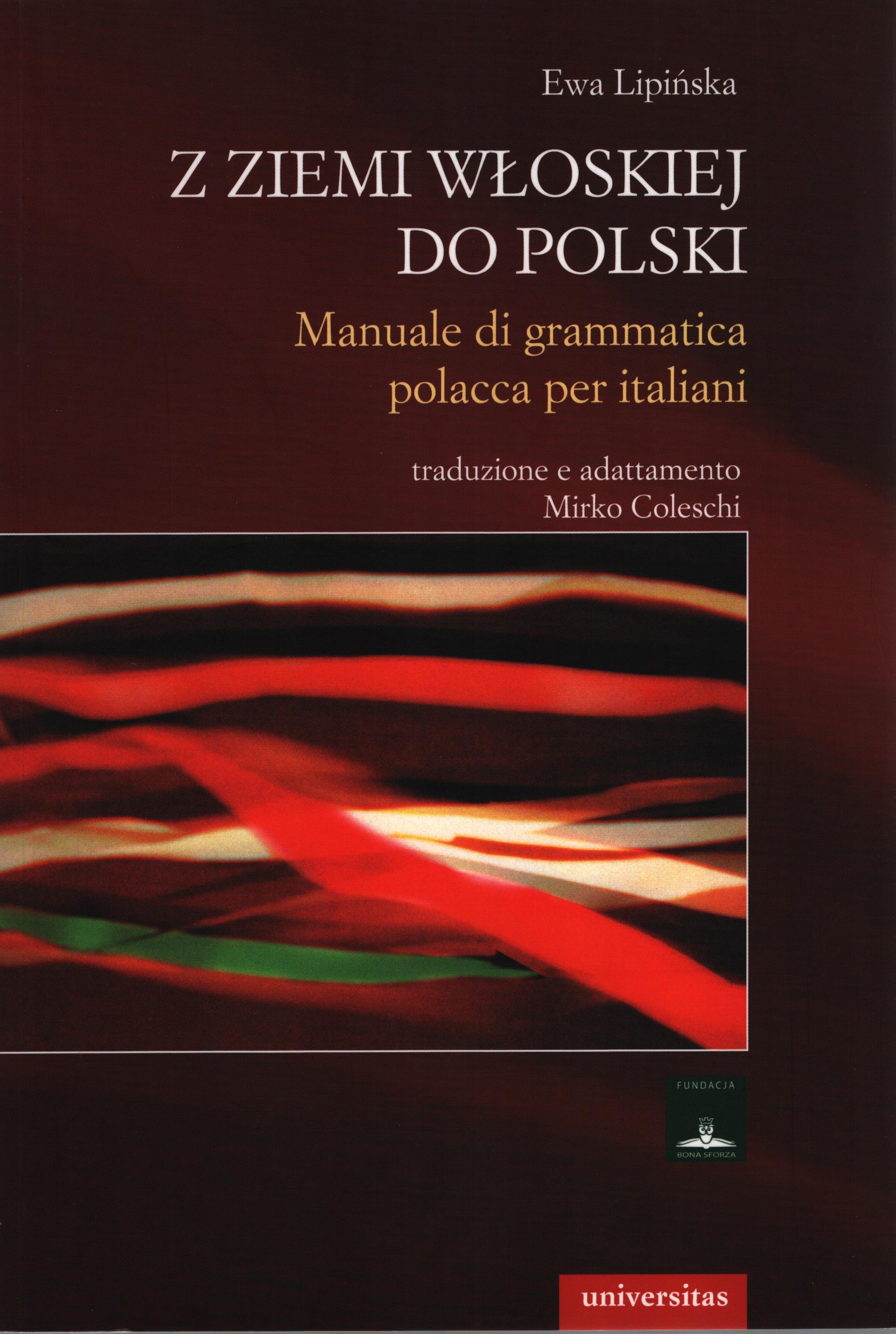 ...Tale pubblicazione è stata adottata come base per la creazione del manuale Z ziemi włoskiej do Polski. Manuale di grammatica polacca per italiani, arricchito e aggiornato, nella traduzione e adattamento ad opera di Mirko Coleschi. Nella nuova versione si è posto l’accento sulla presentazione di temi grammaticali, cosa che ha portato alla creazione di un adattamento specialmente pensato per studenti di polacco madrelingua italiana. Nella versione italiana l’autrice non è venuta meno nel suo intento di presentare gli aspetti principali della grammatica polacca e di inserire numerosi esercizi. Il traduttore ha eseguito diversi paragoni e ha saggiamente messo in evidenza gli aspetti più ostici per gli italiani della grammatica polacca. Il titolo dell’opera Z ziemi włoskiej do Polski, tratto dall’inno nazionale polacco, sottolinea le strette relazioni culturali che da secoli si sono venute a creare tra la Polonia e l’Italia. I brani di entrambi gli inni nazionali, il cui contenuto conferma tali inscindibili relazioni tra i due paesi, sono diventate il leitmotiv dell’opera.