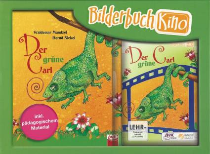 Bilderbücher laden zum Träumen und Entspannen ein. Bunte Bilder und spannende Texte faszinieren jedes Kind. Aber mit der ganzen Klasse/Gruppe ein Bilderbuch lesen? Das wird nun kinderleicht! Das Bilderbuchkino zaubert das Bilderbuch auf eine große Leinwand und schafft eine gemütliche Atmosphäre. Öffnen Sie Ihren Kindern die Augen für die fantastische Bücherwelt des BVK! Alles, was Sie brauchen, sind ein Laptop und ein Beamer oder ein digitales Whiteboard. Das Paket "Bilderbuchkino" beinhaltet: - 1 Bilderbuch - 1 DVD - pädagogisches Material als Kopiervorlage - Bausteine der DVD: Bilderbuch vorgelesen von bekannten Sprechern/der Ton kann wahlweise ausgestellt werden - Hinweise zum Einsatz des Bilderbuchkinos für die Hand der Erzieherin/des Lehrers und der Lehrerin - zahlreiche fertig ausgearbeitete und differenzierte Arbeitsblätter zum Inhalt des Buches für Kinder der 1. und 2. Klasse - zahlreiche vollständig ausgearbeitete Angebote für den Einsatz in der Kita, abgestimmt auf die Bildungsbereiche - Inkl. kreativer Angebote wie z. B. Einladungskarten für die "Kinovorstellung", Filmplakate, farbige Memory-Karten, Masken für ein szenisches Spiel u. v. m.! Zum Inhalt des Buches: Zwischen dem Krokodil und dem Grottenlurch schuf Gott ein seltsames Lebewesen, das er, weil er so in Eile war, einfach „grüner Carl“ nannte. Carl ist ein Meister der Tarnung - leider aber auch ein Versager im Fliegenfangen. Das Problem wird mit ein wenig Hilfe von „oben“ gelöst … Ein wunderschönes Buch, inklusive CD mit der Geschichte und Liedern! Inhalte des pädagogischen Materials: Das Chamäleon - Schöpfung - Gefühle - Tarnung - Reptilien - Wie ist die Welt entstanden? - Farben - Ein Chamäleon in einem Kunstwerk verstecken … Inkl. kreativem Zusatzmaterial