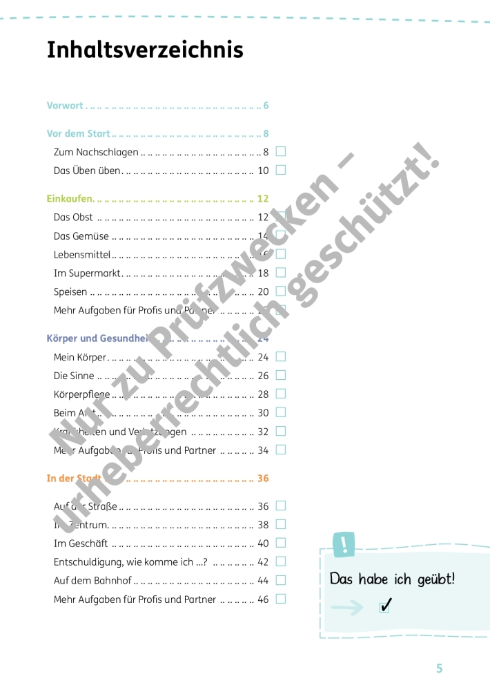Mit Wortschatz üben können sich Schülerinnen und Schüler ab Klasse 2 selbständig einen ausgewählten Basiswortschatz zu verschiedenen Alltagsthemen erarbeiten. Die Kapitel enthalten: zahlreiche Illustrationen: Alle Wörter werden über eine Wort-Bild-Verbindung eingeführt spielerische Aufgaben für die Schule oder zu Hause, Aufgaben für "Profis" und Partner sowie Ideen für Lerngruppen Keines der Kapitel setzt Vorkenntnisse voraus. So kann jedes Kind individuell und passend zu den sprachlichen Anforderungen in Alltag und Schule üben.