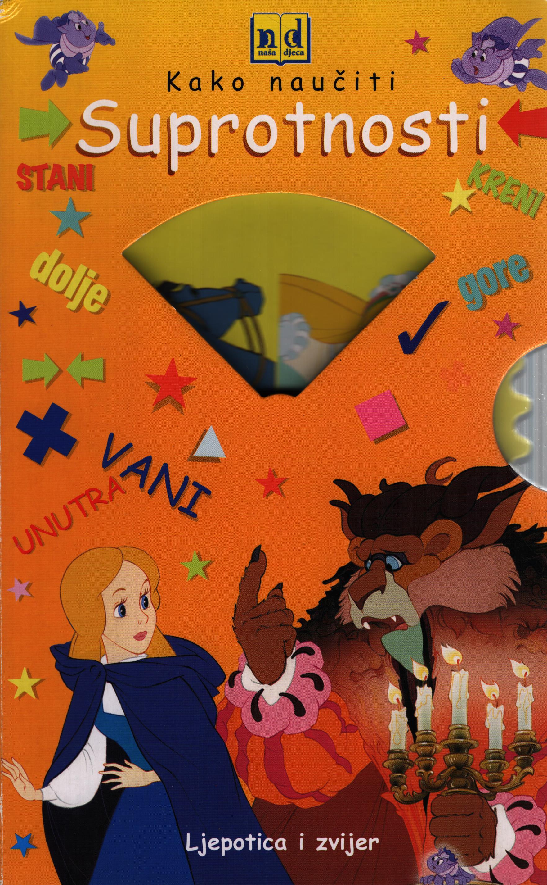 Pomoću poznatih likova iz bajke "Ljepotica i zvijer" maleni će naučiti što je gore - a što dolje, što je sprijeda - a što straga, a i neke druge suprotne pojmove, kao što su sreća i tuga.