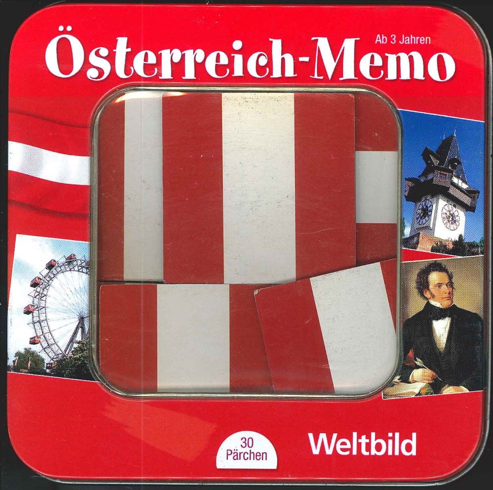 Österreich spielend entdecken. Diese Box enthält 30 Kartenpärchen mit den schönsten und bekanntesten Motiven aus Österreich. Memo-Spielanleitung Alle Kärtchen werden gemischt und mit der Vorderseite nach unten auf den Tisch gelegt. Der jüngste Spieler fängt an und deckt zwei Kärtchen auf. Haben sie die gleichen Motive, darf er sie behalten und es noch einmal probieren. Sind es zwei unterschiedliche Motive, werden die Kärtchen an derselben Stelle wieder umgedreht, und es geht im Uhrzeigersinn weiter. Gewonnen hat, wer am Ende des Spiels die meisten Pärchen hat. Verschluckbare Kleinteile: für Kinder unter drei Jahren nur unter Aufsicht eines Erwachsenen geeignet. Copyright für diese Ausgabe © 2008 by Weltbild Verlag GmbH, Salzburg Alle Rechte vorbehalten. Gestaltung: Tobias Rinnenburger für agilmedien, Köln www.weltbild.at