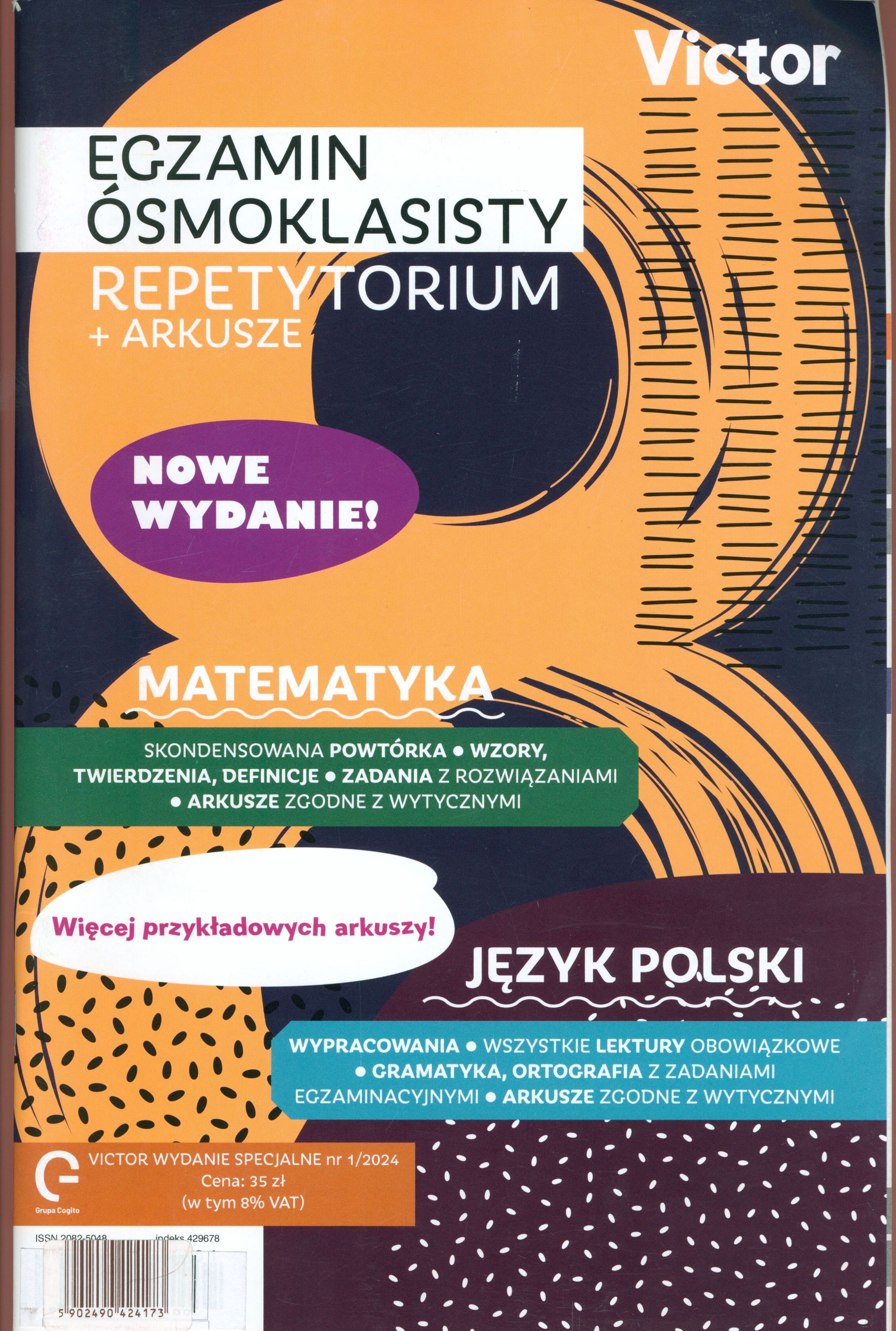 Na okładce: Victor nowe wydanie. Matematyka. Skondensowana powtórka, wzory, twierdzenia, definicje, zadania z rozwiązaniami, arkusze zgodne z wytycznymi. Język polski. Wypracowania, wszystkie lektury obowiązkowe, gramatyka, ortografia z zadaniami egzaminacyjnymi, arkusze zgodne z wytycznymi.
