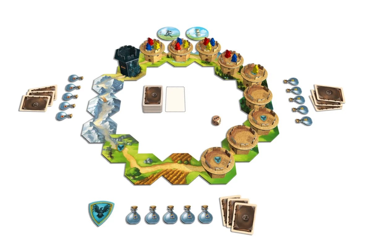 Zawiera: 4 części toru ruchu, 9 wież, zamek kruków, 8 płytek czarów, 36 żetonów kolb, 30 pionków czarodziejów, 90 kart ruchu, kość, znacznik pierwszego gracza, instrukcja.