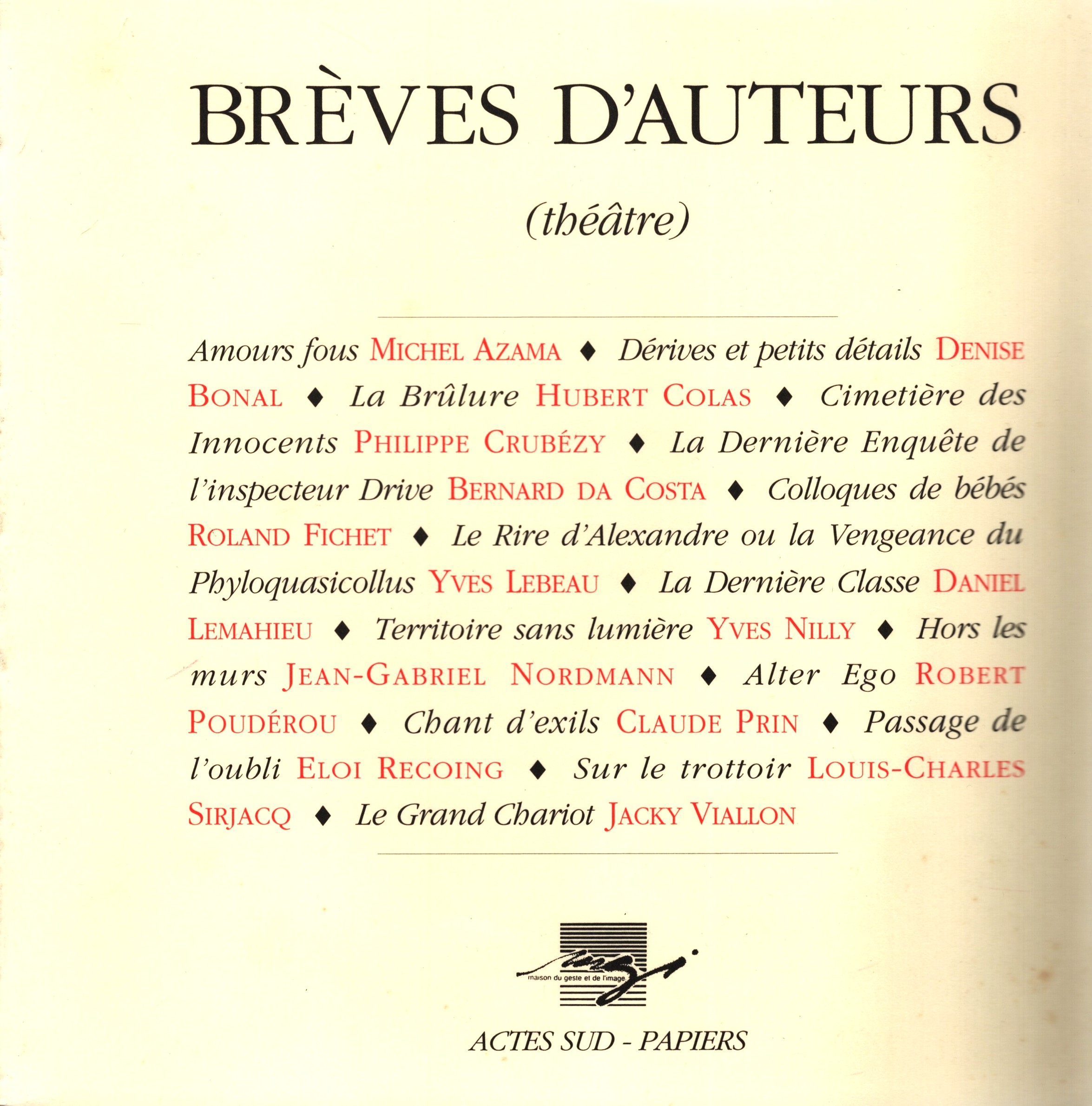 Amours fous / Michel Azama. Dérives et petits détails / Denise Bonal. La Brûlure / Hubert Colas. Cimetière des Innocents / Philippe Crubézy. La Dernière Enquête de l'inspecteur Drive / Bernard da Costa. Colloques de Bébés / Roland Fichet. Le Rire d'Alexandre ou la Vengeance du Phyloquasicollus / Yves Lebeau. La Dernière Classe / Daniel Lemahieu. Territoire sans lumière / Yves Nilly. Hors les murs / Jean-Gabriel Nordmann. Alter Ego / Robert Poudérou. Chant d'exils / Claude Prin. Passage de l'oubli / Eloi Recoing. Sur le trottoir / Louis-Charles Sirjacq. Le Grand Chariot / Jacky Viallon.