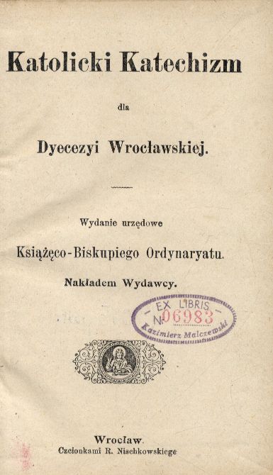 Katolicki katechizm dla Dyecezyi Wrocławskiej. - Wrocław : nakładem wydawcy, [nie przed 1903] (Wrocław : czcionkami R. Nischkowskiego). - XXIV, 128, 32 strony ; 18 cm.