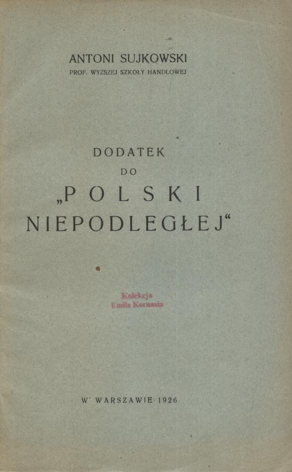 Dodatek do "Polski Niepodległej" / Antoni Sujkowski prof. Wyższej Szkoły Handlowej. - Warszawa : [wydawca nieznany], 1926 (Warszawa : Drukarnia Leona Nowaka). - [4], 60, [1] strona ; 24 cm.
