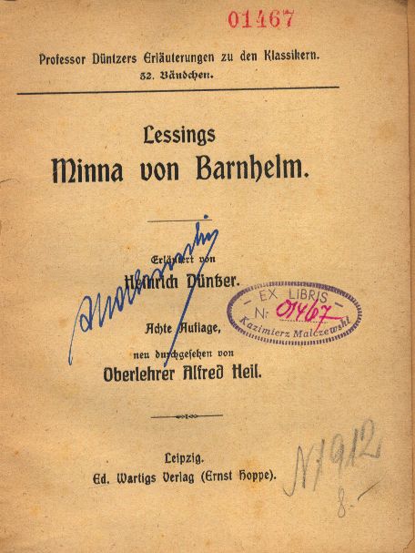 Lessings Minna von Barnhelm / Erläutert von Heinrich Düntzer. - 8. Auflage, neu Durchgesehen von Alfred Heil. - Leipzig : Ed. Wartigs Verlage (Ernst Hoppe) , [1910]. - 171, [1] stron ; 16 cm.