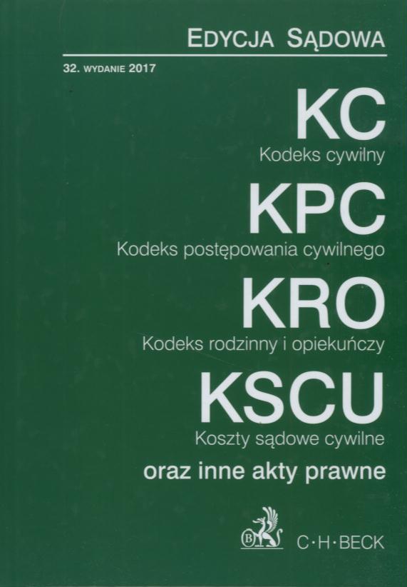 Stan prawny KC: 1.1.2017 r. (Dz.U. z 2016 r. poz. 2255). KPC: 18.1.2017 r. (Dz.U. z 2017 r. poz. 85) oraz w podwójnym stanie prawnym 1.3.2017 r. (Dz.U. z 2015 r. poz. 1311 ze zm. i Dz.U. z 2016 r. poz. 1948). KWU: 1.3.2017 r. (Dz.U. z 2016 r. poz. 1948). KSCU: 18.1.2017 r. (Dz.U. z 2017 r. poz. 85). KC. KPC. KRO. KSCU. Edycja Sądowa zawiera: Kodeks cywilny, Przepisy wprowadzające Kodeks cywilny, Kodeks postępowania cywilnego, Przepisy wprowadzające kodeks postępowania cywilnego, Ustawę o księgach wieczystych i hipotece, Kodeks rodzinny i opiekuńczy, Ustawę - Przepisy wprowadzające Kodeks rodzinny i opiekuńczy, Ustawę o kosztach sądowych w sprawach cywilnych, Prawo prywatne międzynarodowe.