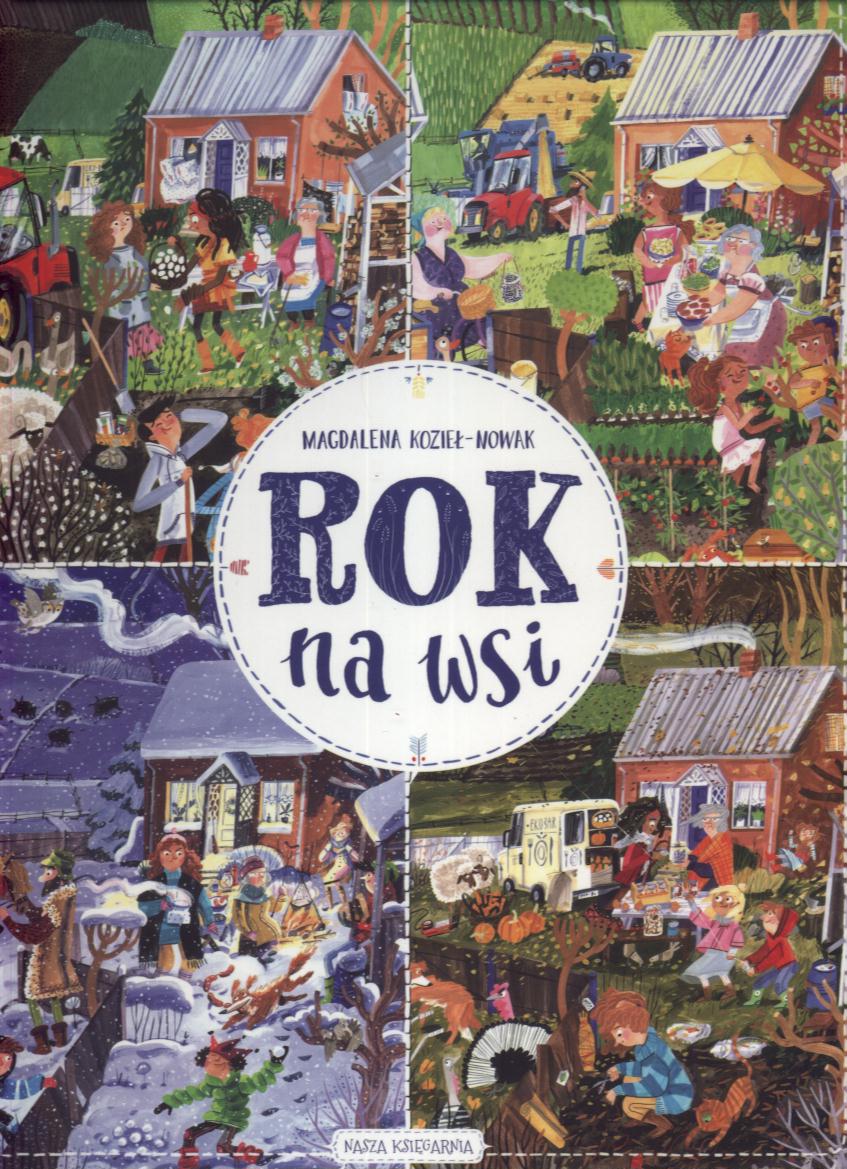 "Rok na wsi" zawiera dwanaście rozkładówek przybliżających życie w gospodarstwie. Dowiemy się, jakie obowiązki ma dziecko, a jakie dorosły, na czym polega praca na polu i przy zwierzętach. Dodatkowe dwie plansze to przedstawienie bohaterów oraz zabawa interaktywna.