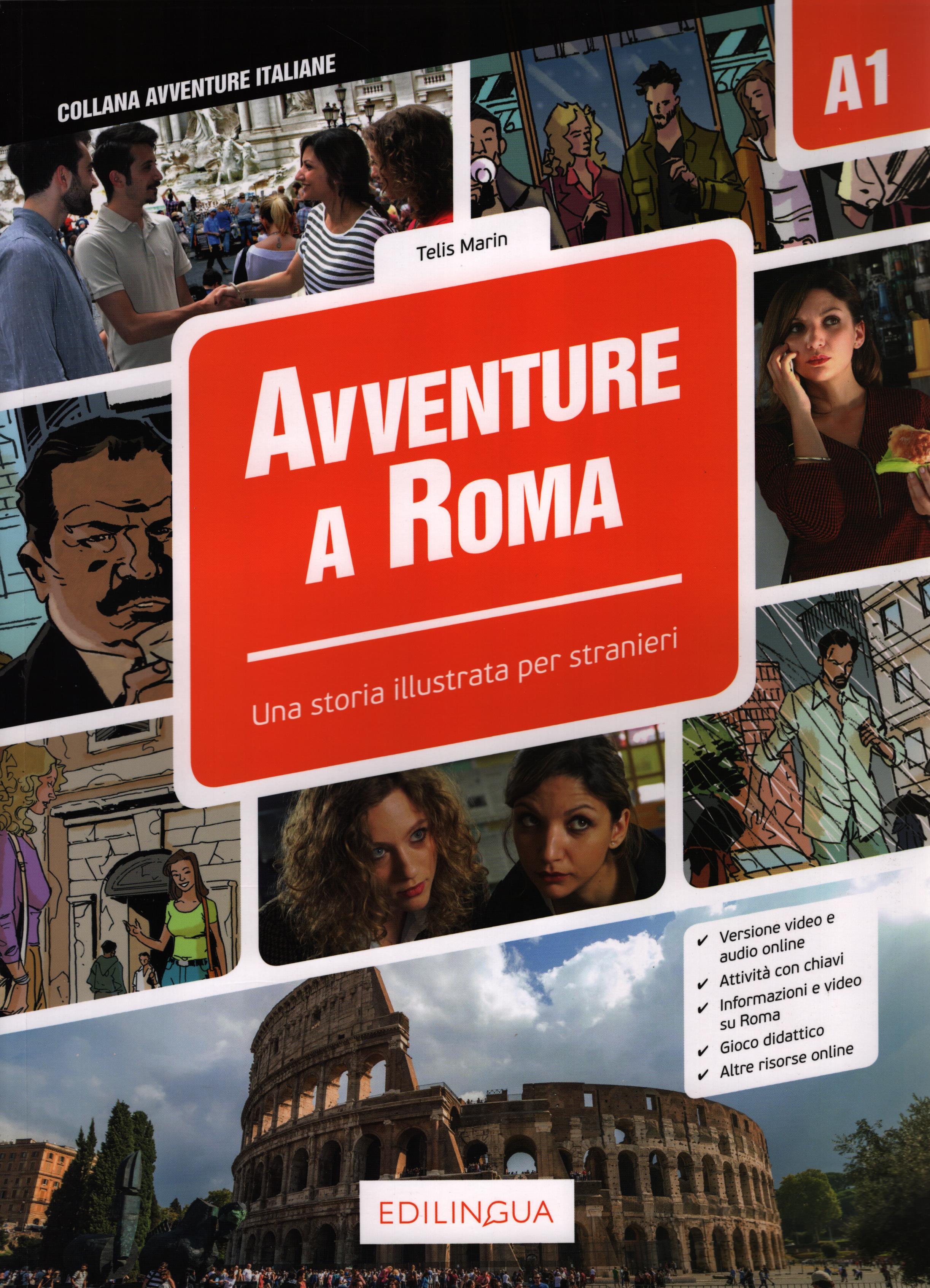 Na okładce: Versione video e audio online ; Attività con chiavi ; Informazioni e video su Roma ; Gioco didattico ; Altre risorse online.