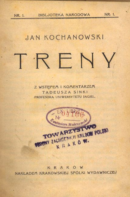 Treny / Jan Kochanowski ; z wstępem i komentarzem Tadeusza Sinki. - Kraków : Krakowska Spółka Wydawnicza, [1919] (Kraków : Drukarnia Narodowa). - XXXVI, [4], 76, [1] strona ; 17 cm.