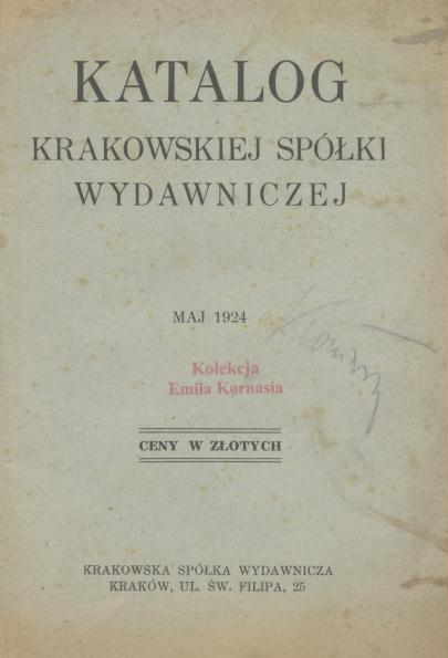 Katalog Krakowskiej Spółki Wydawniczej : maj 1924. - Kraków : Krakowska Spółka Wydawnicza, [1924] (Kraków : Druk W. L. Anczyca i Spółki). - 52 s, ; 16 cm.