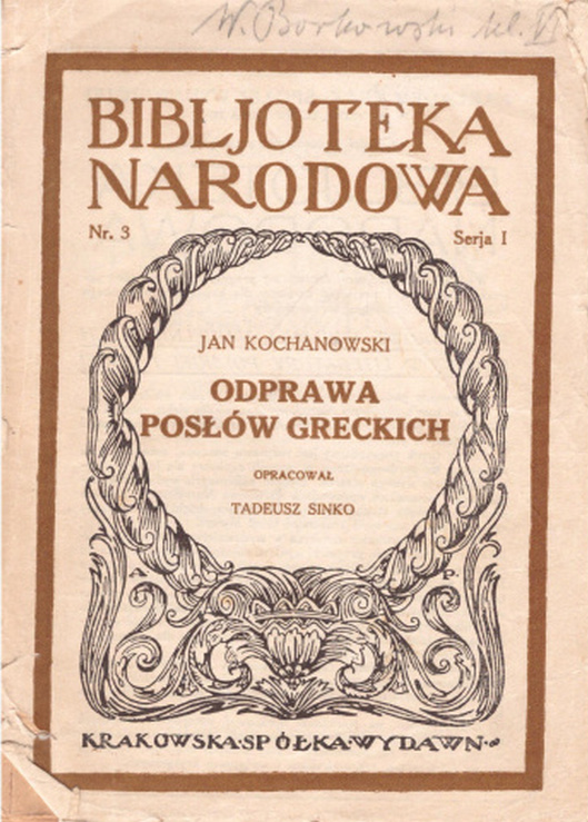 Odprawa posłów greckich / Jan Kochanowski ; z wstępem i komentarzem Tadeusza Sinki. - Wydanie 6 przejrzane. - Kraków : Krakowska Spółka Wydawnicza, [1928] (Kraków : Drukarnia Narodowa). - XL, 46 stron ; 17 cm.