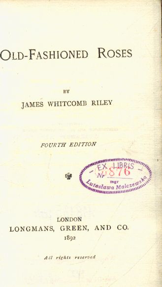 Old Fashioned Roses / James Whitcomb Riley. - Fourth edition. - London : Longmans, Green and Co., 1892. - 145 stron ; 16 cm.